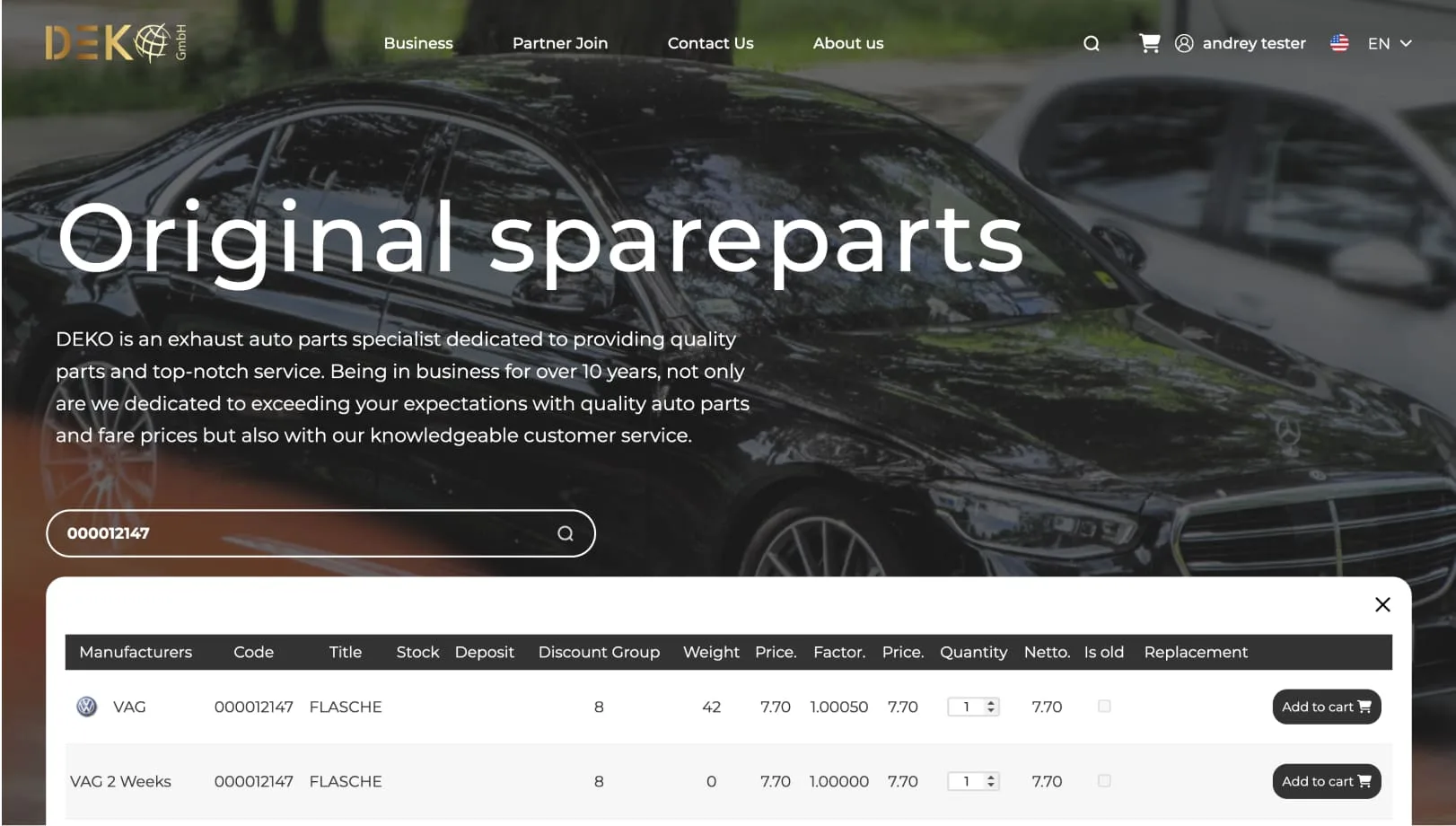 In a few months, our team has developed, tested, and launched a modern high-loaded e-commerce product that allows auto dealers, repairs, and other automotive businesses to order large numbers of auto parts and get discounts on bulk purchases because of a comprehensive loyalty program with advanced individual discounts depending on brand, manufacturer, amount, terms of delivery, logistics, etc. The new platform has replaced the outdated system the company has used in the past. The platform consists of the end-user e-commerce website, admin panel for managing clients, requests, orders, stock, pricelists, and discount groups, back-end core managing business logic and communication between user interfaces and database, and cloud infrastructure.