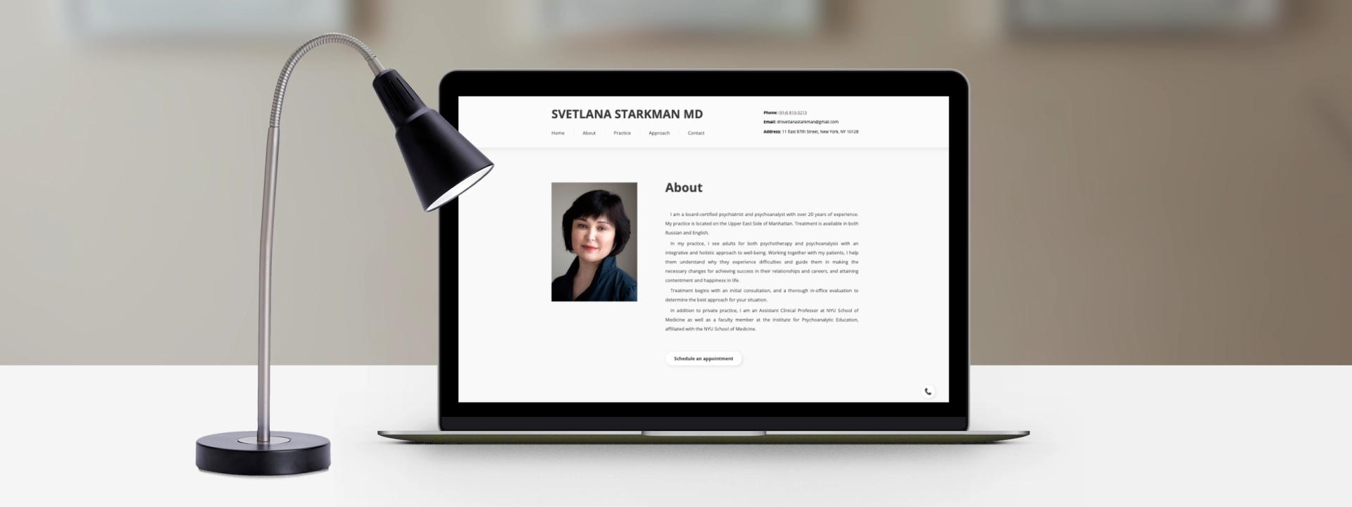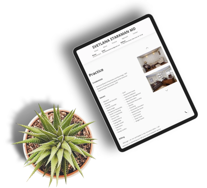 This business card website was developed for a board-certified psychiatrist and psychoanalyst, Svetlana Starkman. It gives a full description of who Dr. Starkman is and how to contact her directly. In addition to the doctor’s contact details a visitor can find on the site, they can also schedule an appointment right on the website without any unnecessary actions like opening mailing platforms, etc.