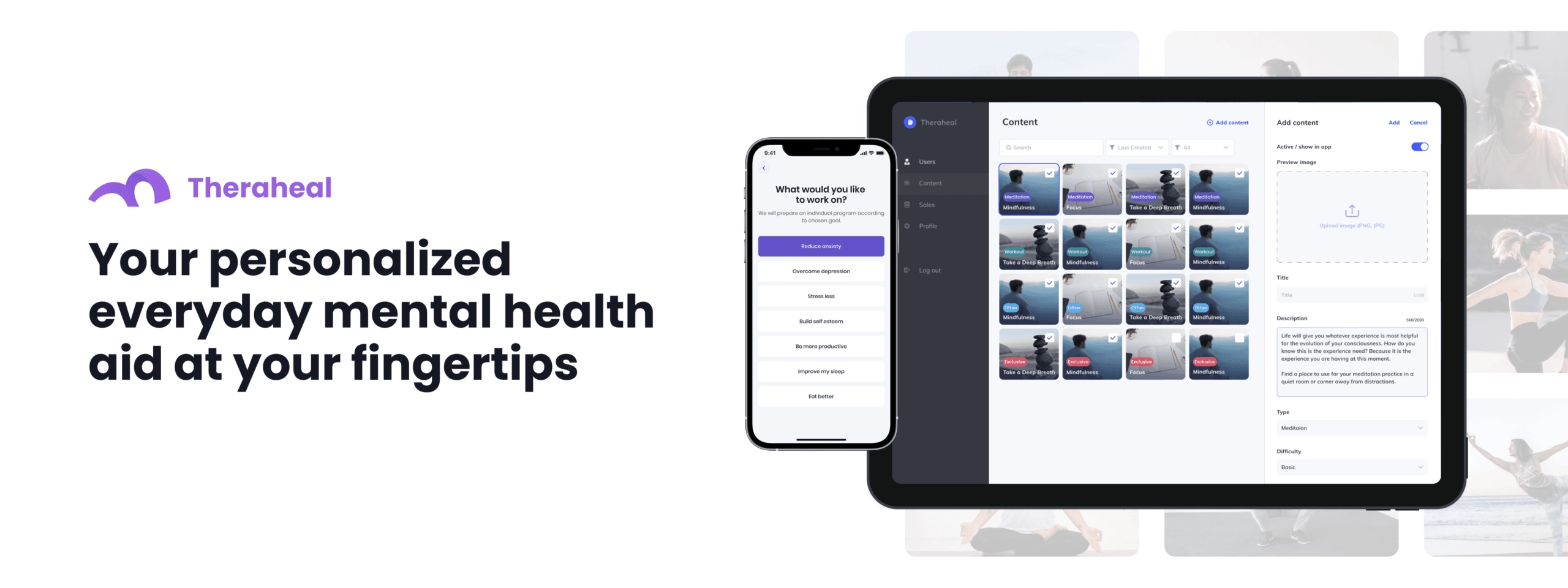 Theraheal is a mobile application for clients to harmonize various critical elements of life. It assists in modifying daily schedules, adopting a healthier diet, participating in exercise routines, practicing mindfulness meditation, and seeking expert advice during challenging times. By incorporating these straightforward activities, individuals can improve their sleep, increase productivity, enhance physical fitness, elevate self-confidence, alleviate anxiety, manage stress, and gradually enhance their overall well-being. The Powercode Group team The Powercode Group team handled the following tasks: cloud infrastructure, back-end development, and administration panel implementation.