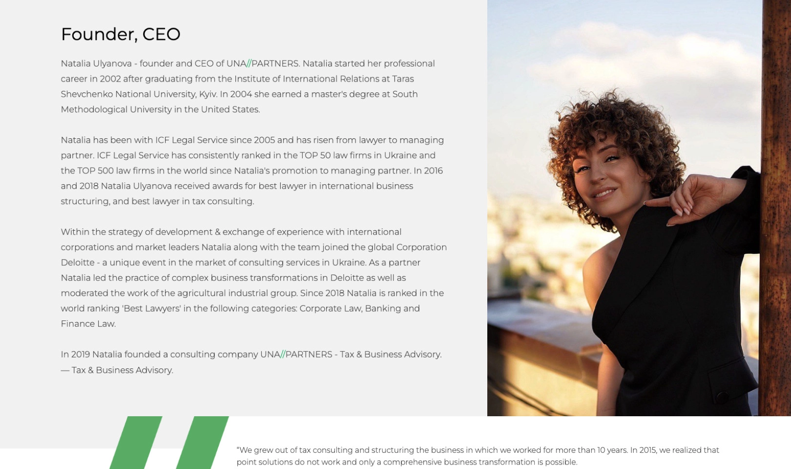 This business website was the first of numerous productive projects with one of the leading Tax and Business Advisory companies. It provides relevant and detailed information about its products and their peculiar features. In addition to professional details, a visitor can learn about a UNA//PARTNERS’ founder, Natalia Ulyanova, and her achievements.